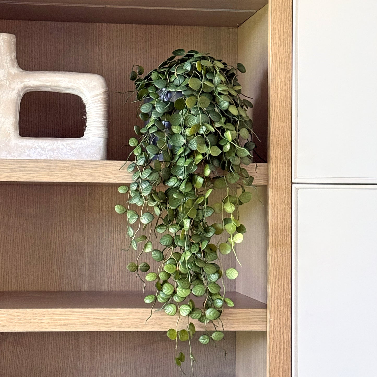 A statement of effortless greenery, our Hanging Button Leaf cascades gracefully from a matte black ceramic pot, creating a soft, organic flow.